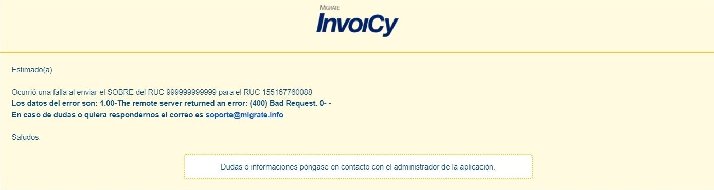 En caso de que el receptor no tenga la URL registrada en la pantalla de "Emisores Electrónicos" o sea una dirección de servicio web inválida, después de tres intentos de envío, InvoiCy enviará un correo electrónico con el asunto "InvoiCy | Intercambio entre emisores - Error" al responsable técnico del receptor informando sobre el fallo de comunicación.