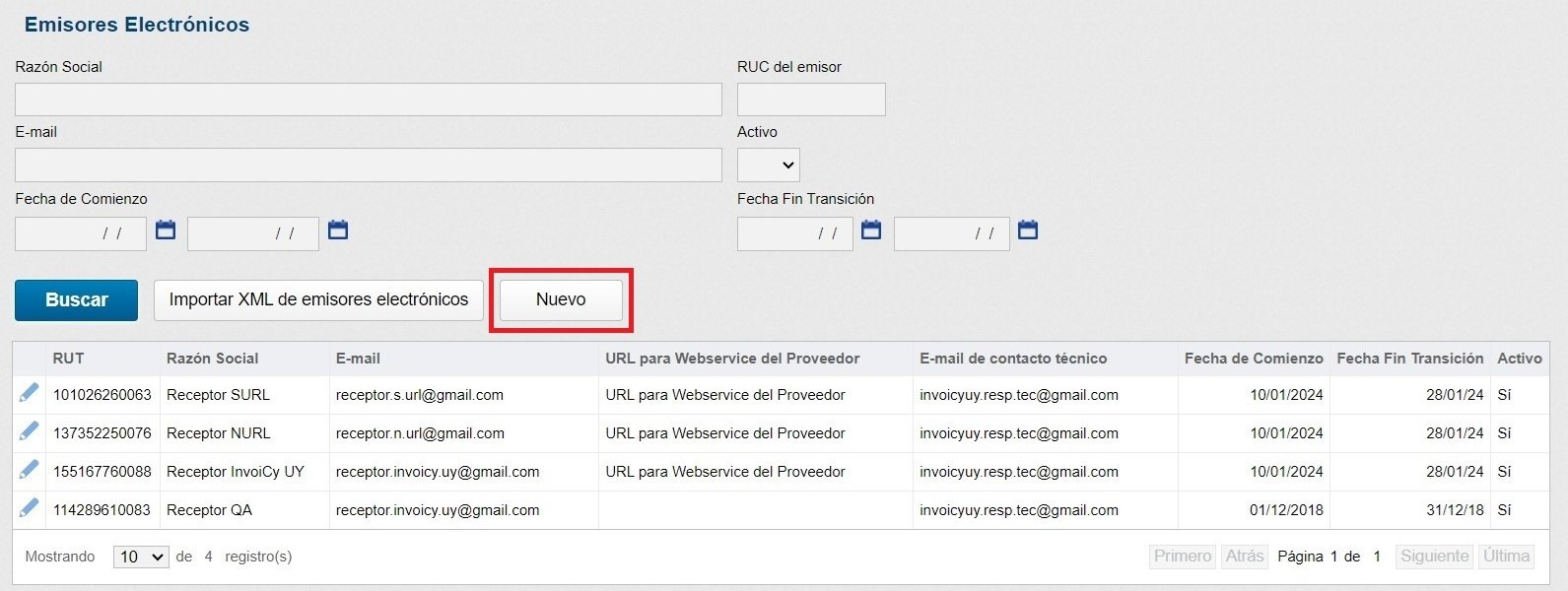 Sin embargo, este proceso no se lleva a cabo en el ambiente de Pruebas, ya que la DGI no proporciona un método para la búsqueda de estos datos en Homologación. Por lo tanto, para registrar información en esta pantalla y realizar pruebas con receptores electrónicos, se ha añadido una opción "Nuevo" que estará disponible únicamente en dicho entorno.