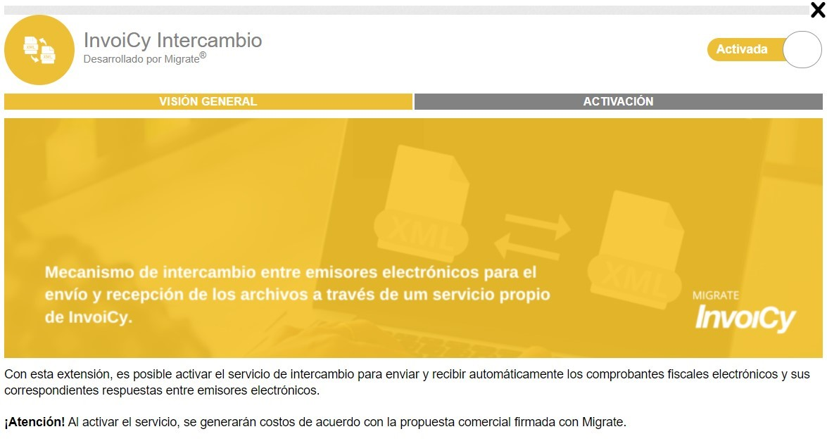 Al hacer clic en la opción "InvoiCy Intercambio", se mostrará la pantalla donde podrá activar o desactivar el uso de la extensión.