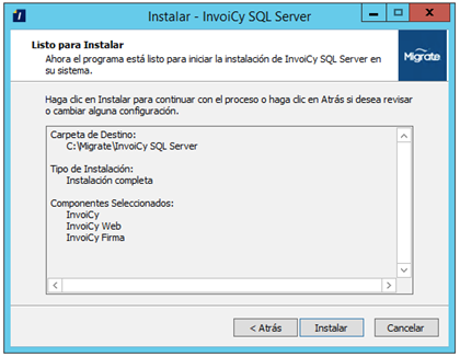 Verifique si la carpeta de destino es la especificada en esta etapa, si fuera la correcta, haga clic en instalar para realizar la instalación del sistema.