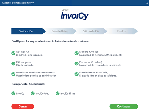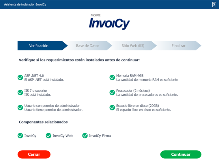 Si ocurriera algún error en alguna de estas validaciones, es necesario corregirlas antes de continuar la instalación. Para proseguir haga clic en “continuar”.