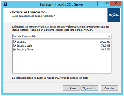 En esta pantalla será necesario seleccionar los módulos del sistema que serán instalados. El módulo InvoiCy contiene la aplicación en general, empresas, certificados, usuarios, CAE, entre otras funciones. InvoiCy Web contiene la parte pública de la aplicación, donde se podrán consultar los CFE emitidos y el módulo InvoiCy Firma realiza la firma de los CFE. Los módulos podrán ser instalados en servidores diferentes de acuerdo a la preferencia de la empresa.