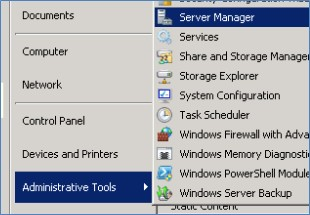 El primer paso para la instalación de InvoiCy es instalar el objeto “Static Content” en el servidor, para eso vaya a “Start”, después abra ”Administrative Tools” y haga clic en “Server Manager”, como se puede observar a continuación.