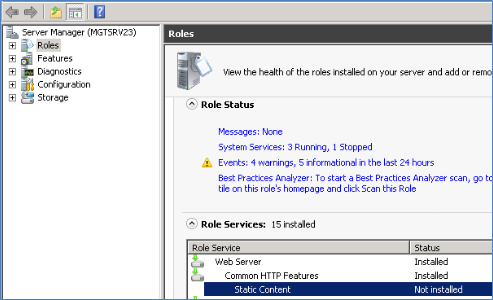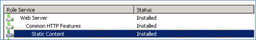 Después de abrir “Server Manager” será necesario instalar el ítem “Static Content”, para eso haga clic en el ítem “Roles” al lado izquierdo de la página abierta y haga clic en el objeto “Static Content” que está debajo del objeto “Common HTTP Features”.