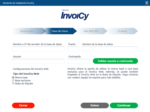 Base Exclusiva: Se utiliza cuando InvoiCy Web se ha instalado en un servidor diferente al de InvoiCy, utilizando una base de datos exclusiva permitiéndose así la instalación de InvoiCy Web en un servidor Cloud. Así InvoiCy estará haciendo la sincronización de los comprobantes entre los módulos. Ya no es necesario tener habilitada la conexión directa con la base de datos.